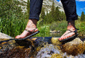 Yes, all of our sandals can be worn in water. The Earth-Grip footbed—which can be found on our Circadian and Alpha models—resembles the feel of a mild bare earth experience, but with superior all-weather traction. The 100% cotton footbed will hold some water weight until it has a chance to dry. In comparison, our Primal model dries much quicker by featuring no Earth-Grip footbed, but the trade-off is less effective grip/performance in water.